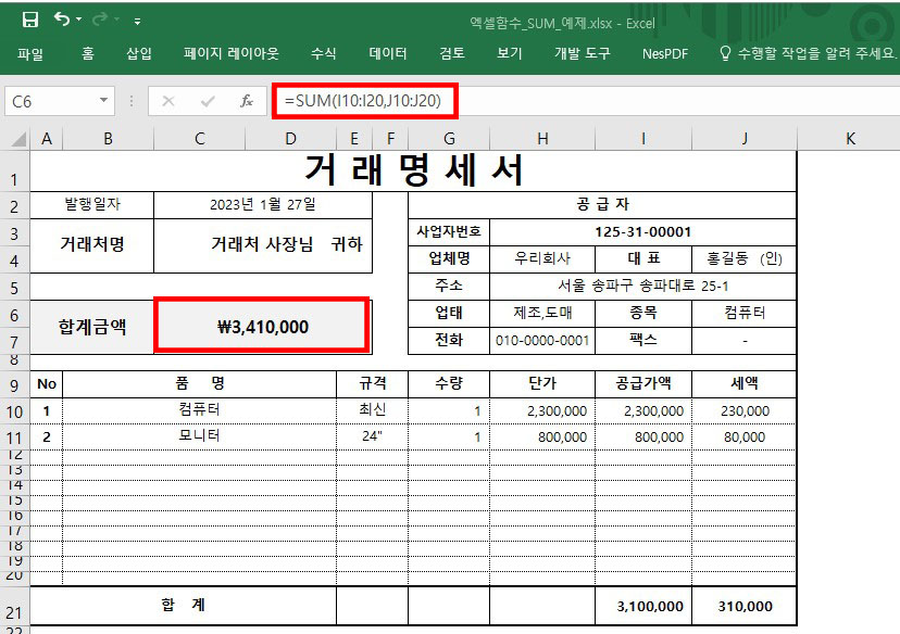 합계금액 =SUM(I10 : I20, J10 : J20)